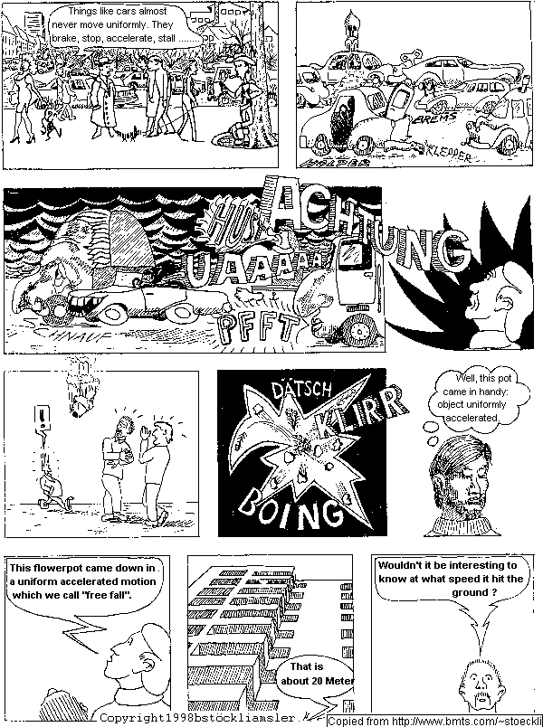 | PHYSICS COMICS NAVIGATION (Table of Contents) GO TO: Velocity on page 2 Acceleration on page 5 Free Fall on page 10 Relativity of Motion on page 13 Forces on page 14 Newton's first Law of Motion on page 16 Inertial Force on page 17 The Unit of Force on page 18 Newton's second Law of Motion on page 19 Mass: Heavy Mass and Inertial Mass on page21 Forces on a slope on page 23 Division of Forces on page 25 Free Fall revisited on page 28 Braking and Friction on page31 Measuring Forces on page 34 Forces on a slope: Vectors on page 36 Levers on page 40 |